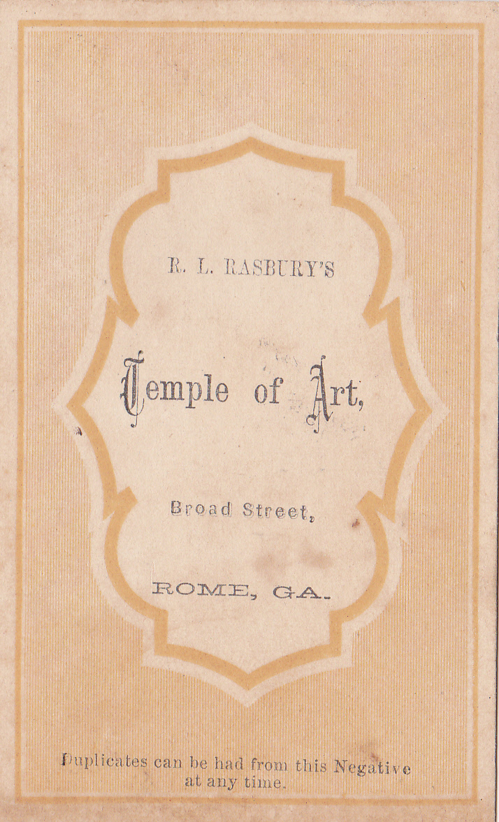 In 1870 they heard of a gallery for sale in Rome, Georgia. This was the gallery of R. L. Rasbury; his Empire Photograph Gallery was located over Veal’s Jewelry Store on Broad Street.  He also advertised as “R.L. Rasbury’s Temple of Art.” Rasbury was leaving for Texas.