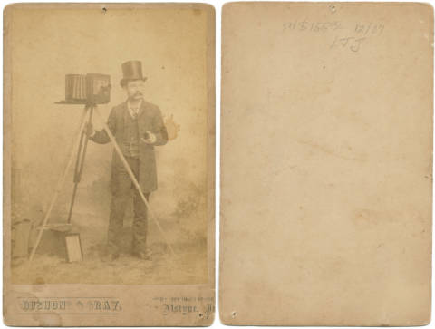 Studio portrait of John C. Bushong with camera, cabinet card by Bushong & Gray; Southern Methodist University, Central University Libraries, DeGolyer Library