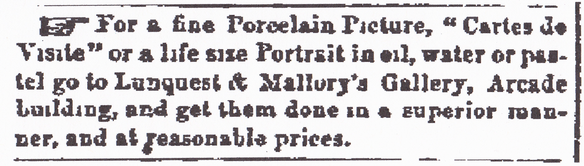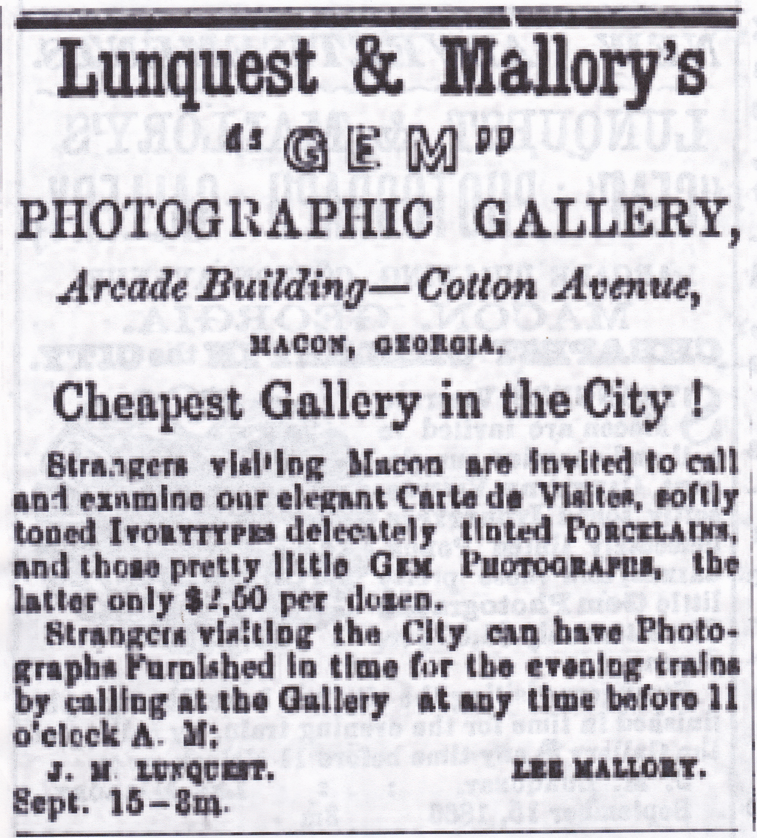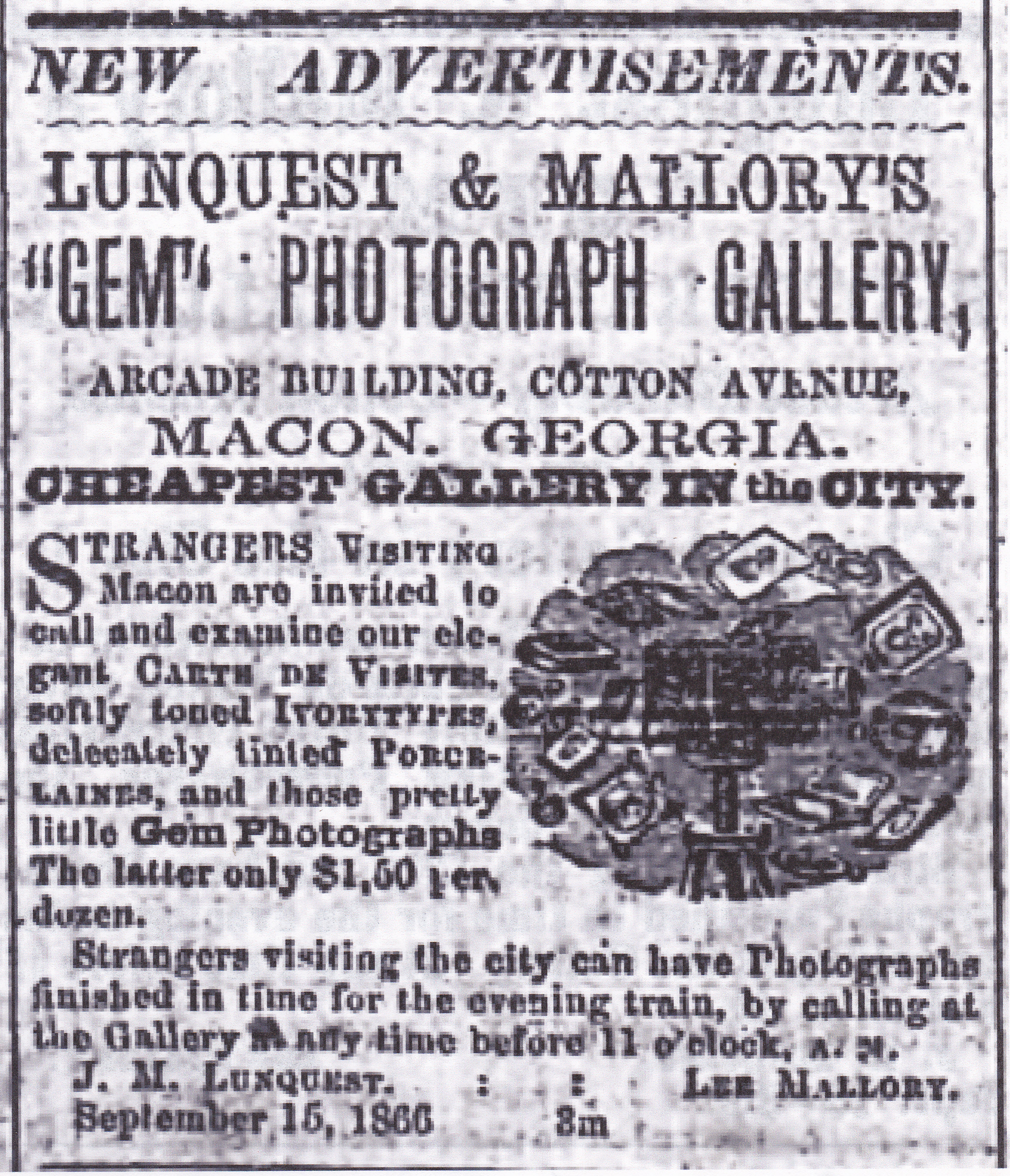 By September 1866 Mallory was listed in advertisements as Miniature Artist. In September and October Lunquest and Mallory ran an advertisement for their Gem Photographic Gallery in newspapers outside of Macon, including Albany and Americus, Georgia. Also in September, in addition to the regular Gems on cards, they advertised Vignette Gems on cards, and Porcelain Pictures on cups, vases, breastpins or any Chinaware – priced according to style of painting.