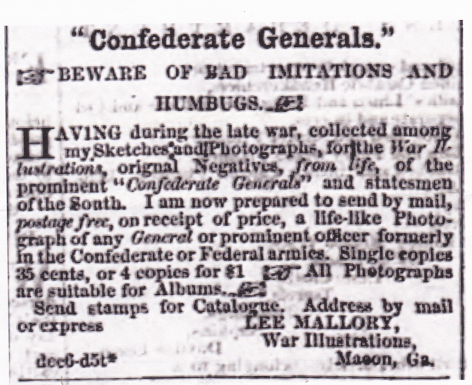 In November 1865 “that accomplished artist, Lee Mallory” was in Georgia’s capital, Milledgeville, and he had opened a gallery. In his collection [of paintings] were “a number of prominent members of the convention.” (Macon Telegraph, 2 November 1865 p 3) In December he was back in Macon with an offer to sell photographs of “any General or prominent officer formerly in the Confederate or Federal Armies.” (see article reproduced above) I am curious to know which photographers’ negatives Mallory had collected to use. He had advertised for two years in Richmond for sketches, etc. to use in his War Illustrations, and apparently he was able to gather enough for his paintings.