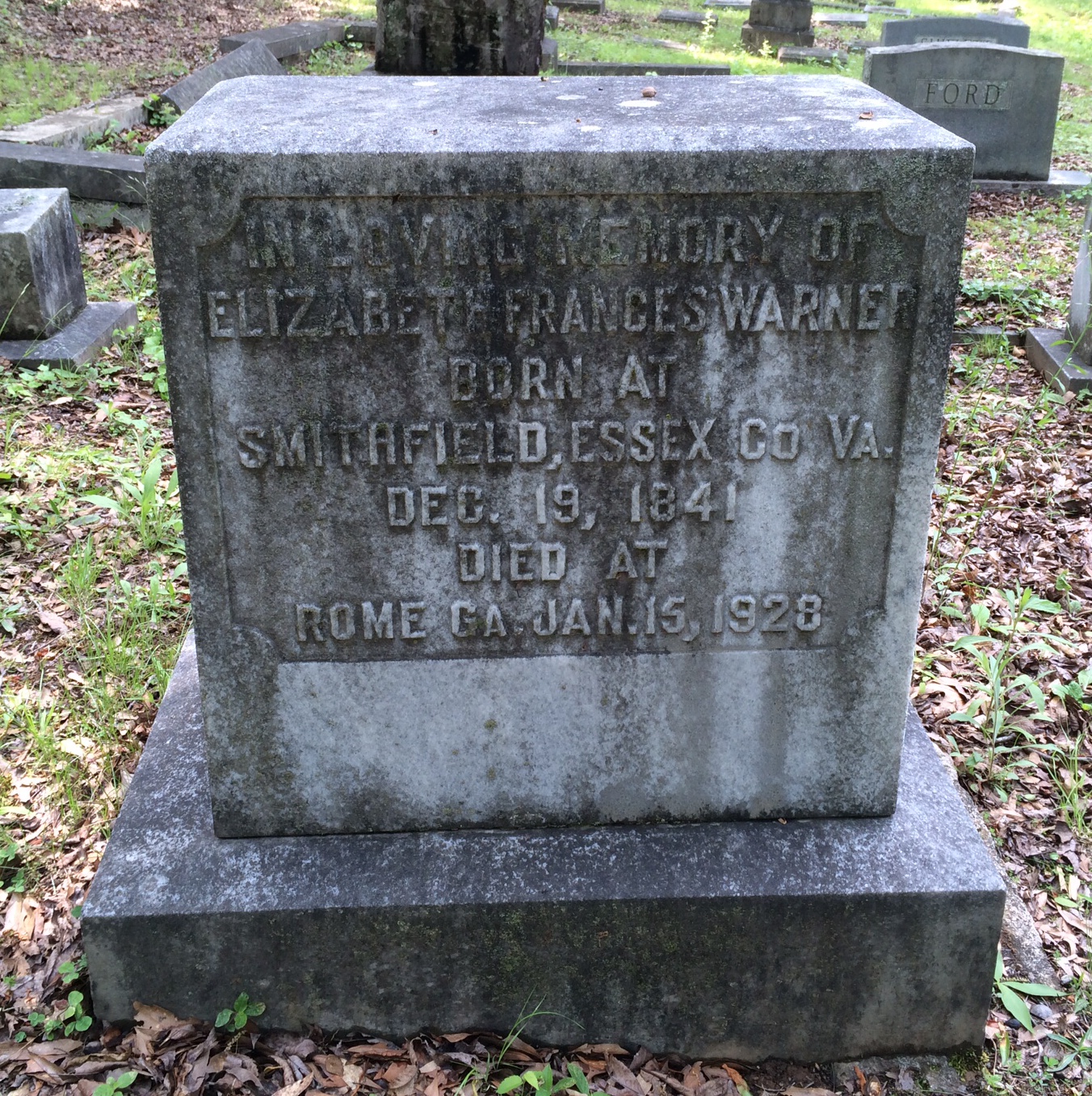 Elizabeth Frances Warner, headstone, Myrtle Hill Cemetery, Rome GA; photo by Traci Rylands 2014