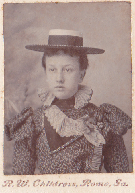 Portrait ( 2 1/4″ x 3 1/2″) of an unidentified young woman in straw boater, or skimmer hat, ca. 1898 , by R. W. Childress, Rome, GA; collection of E. Lee Eltzroth