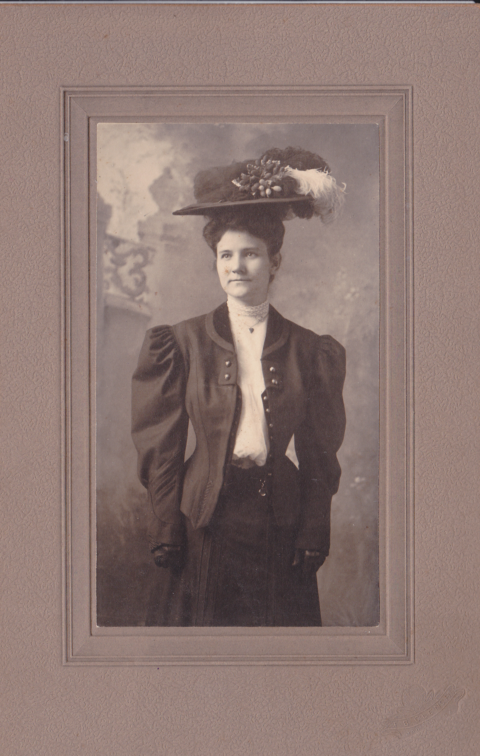 Kate Peacock Arenadall in picture hat with feather, ca. 1905, portrait by F. B. Clench, Madison GA; collection of E. Lee Eltzroth