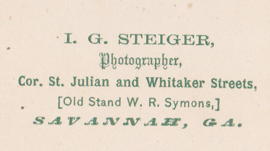 Steiger had the unfortunate luck to have his Savannah photograph card back marks printed incorrectly as I. G. Steiger, rather than as J. G. In both New Haven and Savannah his advertisements were also sometimes incorrect, and at times the city directory also got his initials wrong.