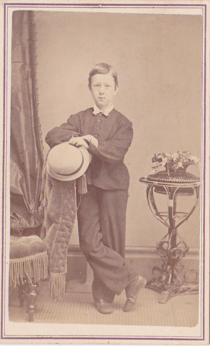 Boy with boater hat in hand. Carte de visite ca. 1870 by J. G. Steiger, Savannah, Georgia; collection of E. Lee Eltzroth