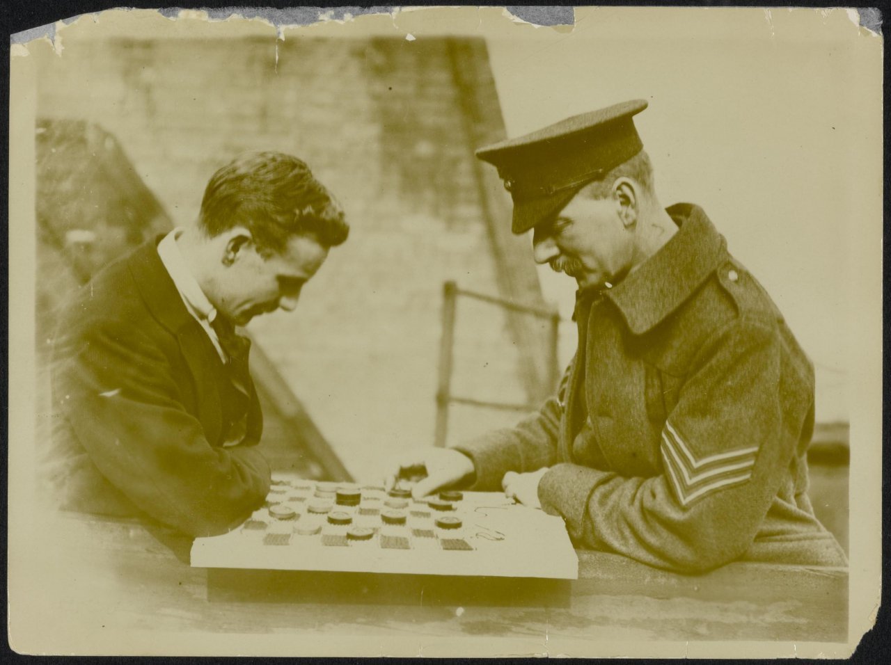 [English] soldiers [prisoner of war?], Playing checkers; from a German source, in the National Archive of the Netherlands WWI Collection, file # 158-0106