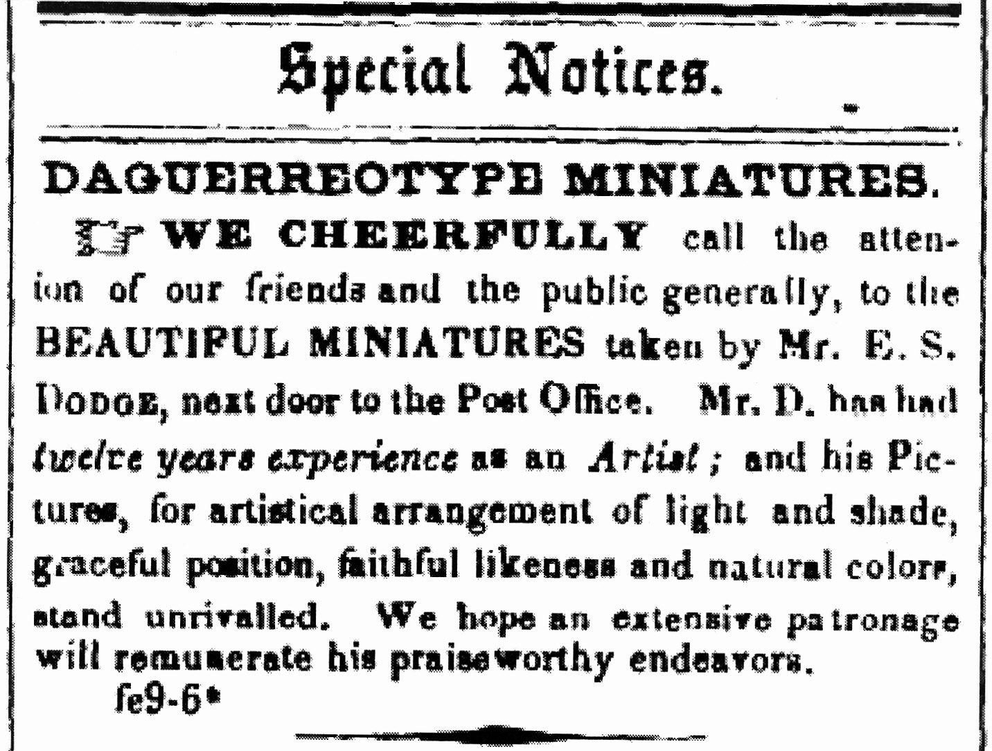 This “Editor’s note” advertisement for E.S. Dodge appeared in the Augusta Chronicle from 9-16 February 1849; Edward Samuel Dodge worked in Augusta GA making daguerreotypes October 1848  into November 1853; he worked there and in other cities earlier as an artist