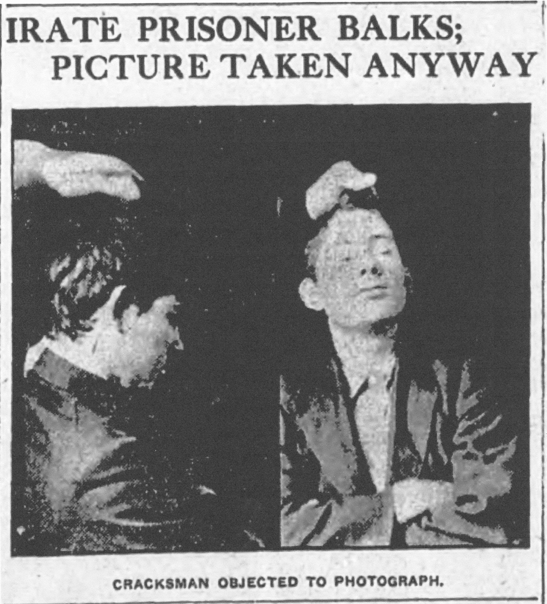 That article regards one Will Knight, a “confessed member of the cracksmen gang” who refused to have his photo taken by police, but was taken to the third floor of the police station “to be photographed by Bertillon Expert J. A. Patterson” who tried and tried to do his work. Two detectives were called in to hold the prisoner, but even “with a heavy hand gripping the back of his head and another in his hair,” Knight “closed his eyes” and Patterson did not get the “real expression of his face.”