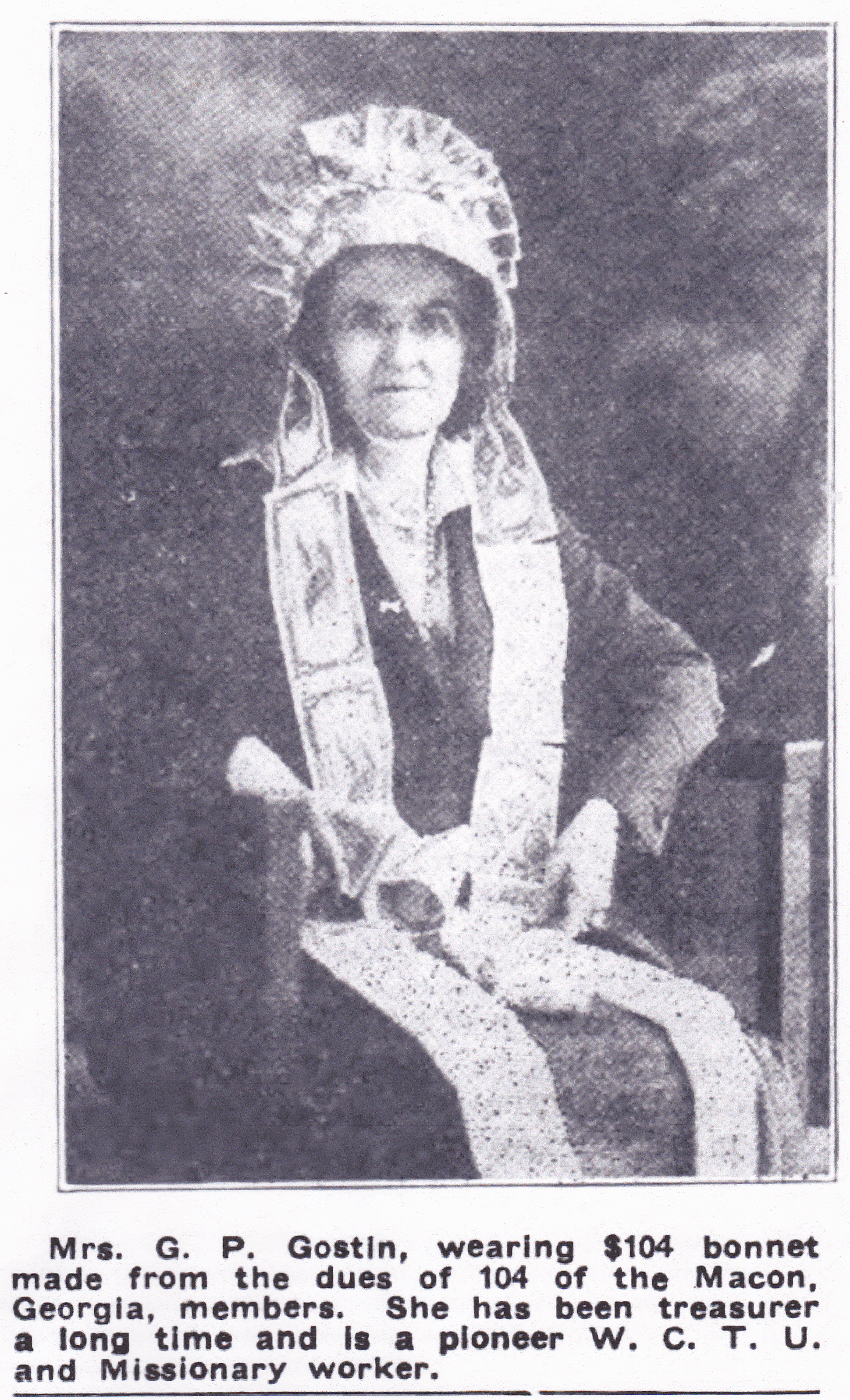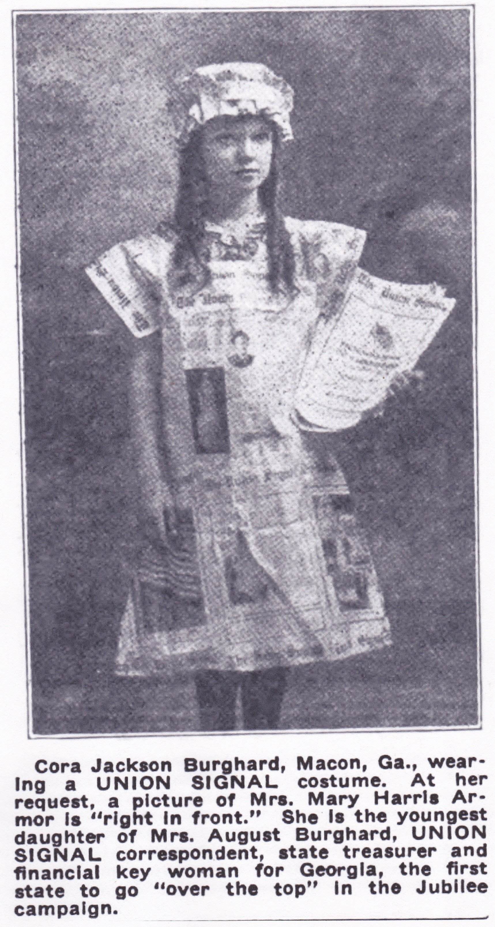 In addition to a straight portrait of Mrs. Haddie Davis Renitz, the Macon agent for the Union Signal, Hearn made photos of young Cora Jackson Burghard in a costume made out of issues of the Union Signal, and one of the treasurer, Mrs. G P. Gostin, wearing a bonnet made of 104 one-dollar bills, representing dues paid by members.