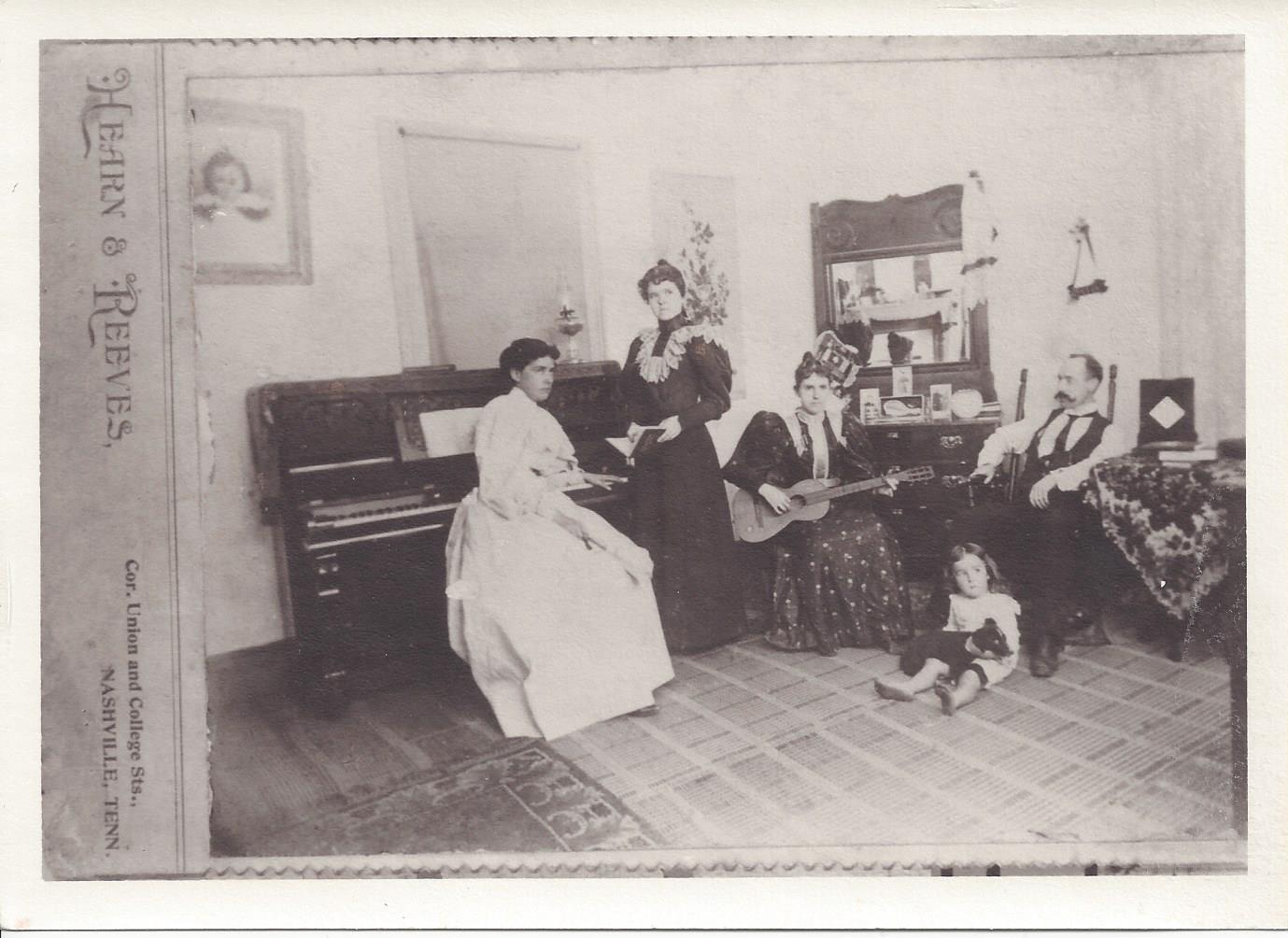 A photograph from the studio of Hearn & Reeves, Nashville; Beulah Reeves at the piano, her sister Augusta Reeves standing near, their brother Walter Rogers Reeves seated, his wife Mary Tennessee “Tennie” Harrison Reeves with guitar, and their son Charles Walton Reeves on the floor, about age five, ca. 1897; courtesy of Ruth Reeves Dill
