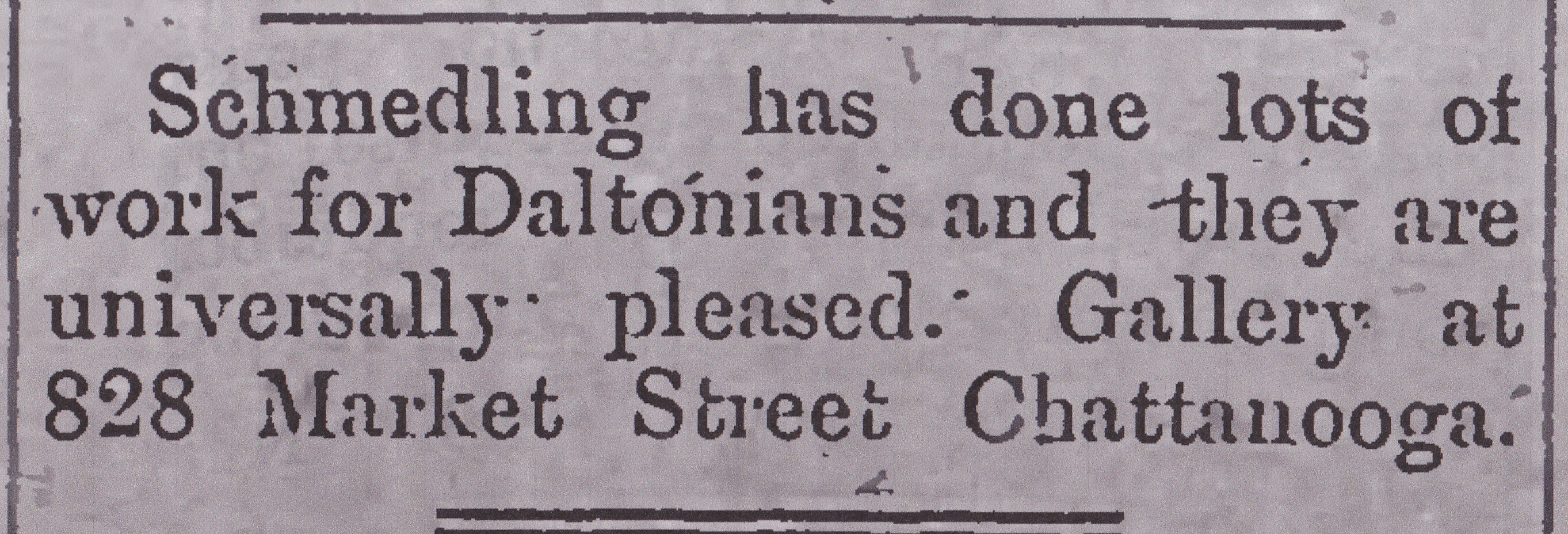 Although he worked there only about ten years (1888-1897), Schmedling became one of the better known of Chattanooga area photographers. Many photographs, in family collections as well as in libraries, archives, and museums, bear his photo mark.