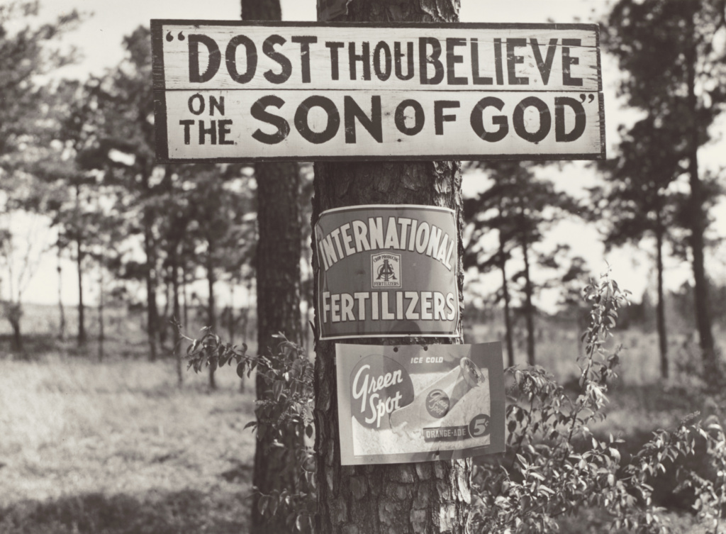 Marion Post Wolcott, Roadside sign, Bible Belt, Greene County, Georgia; Gelatin silver print  1939, Photographed for FSA; J. Paul Getty Museum, object number 2007.8.16