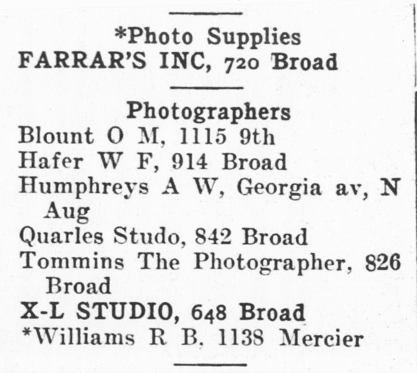 The individual and business listing of the 1921 Augusta city directory shows him as a photographer working at the studio on Gwinnett Street. He was working there when in April 1922, a “burglar, who — took a fancy to one of the photographs [in the window]” entered, and stole that item, but nothing else (Augusta Chronicle April 4, 1922 pg. 8). Although not listed in the city directory in 1923, by 1924, according to an item in the “Lost and Found” column in the October 23, 1924, Augusta Chronicle (pg. 8, col. 1), Whitmore was located at 1261 Ninth Street, when a “suitcase containing Camera and Films” was lost in the city, and he offered a reward for their return. This is the final indication I have of his working as an Augusta photographer.