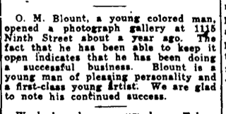 Starting in alphahbetical order, Oliver Mizbah Blount was born in Gough, in Burke County, Georgia, on September 2, 1893. His family was still living in Burke County when he was seventeen in 1910, but they were in Augusta by 1915, when O. M. Blount opened his photograph gallery.