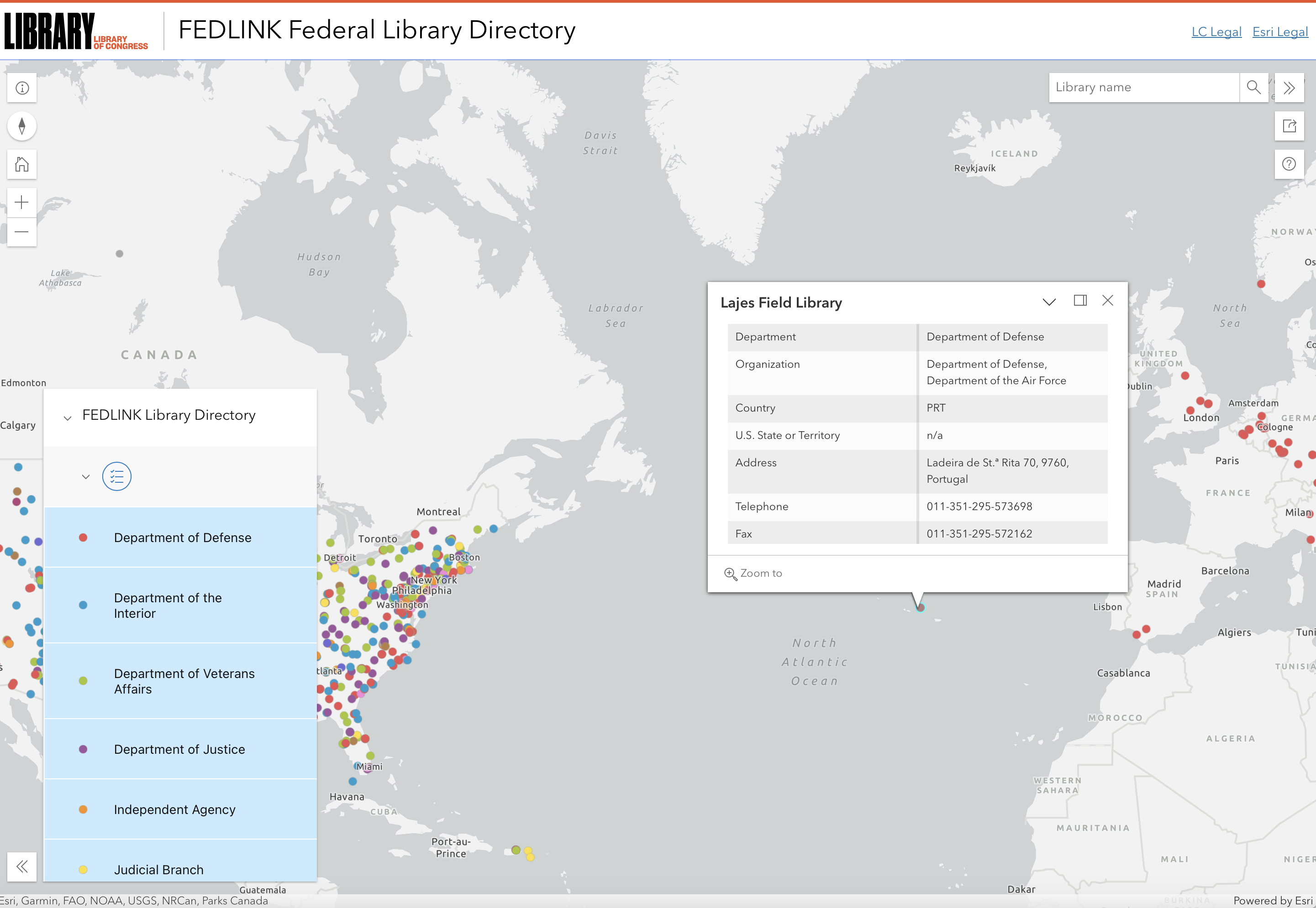 The FEDLINK Federal Library Directory, from the Library of Congress, includes a map pulled directly from the FEDLINK Federal Library Directory, which visualizes the more than one thousand federal libraries located around the world. By clicking on a specific dot, which correspond by color to a department, branch, or other organization, you can see all of the recorded information associated with that library. For example, the red dots on the map represent Department of Defense libraries.  To go to a specific library, click the “Zoom in” button on the left side of the map (+ symbol) or use the scroll wheel of your mouse. You can use the search bar in the top right corner and type the name of the library that you are seeking, even if you use just a part of the library name.