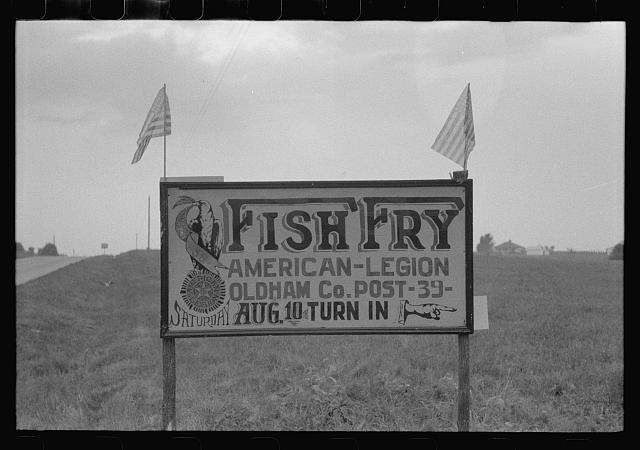 Marion Post Wolcott. Sign for the American Legion fish fry, Oldham County, Post 39, near Louisville, Kentucky, Aug. 1940; U.S. FSA/OWI Collection, Library of Congress Prints and Photographs Division, LC-DIG-fsa-8a43064 (digital file from original neg.)
