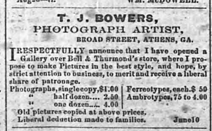 In May 1878, T. J. Bowers assisted at F. N. Barnes’s Forsyth photo gallery. Barnes called “Mr. T. J. Bowers, one of the finest photographers in the City of Atlanta….[for those who] wish portraits executed…., or who desire Pictures to be taken of Landscape, Dwellings, or any other view, will find this a good time to have it done.”