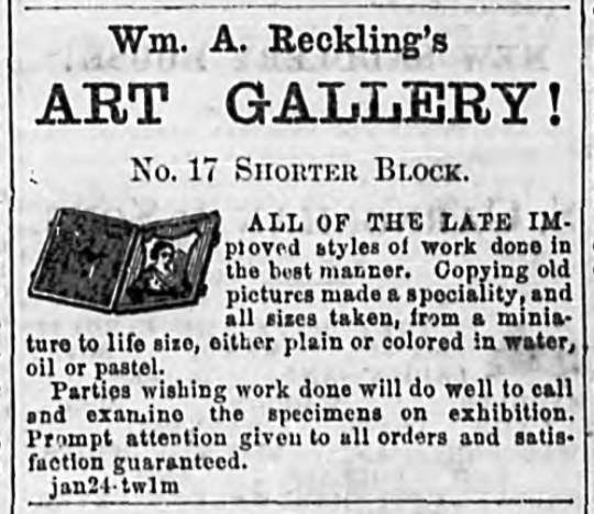 Their partnership was over by 1872, and Bowers moved to Elberton, but Edwin F. King, the artist, was still associated with William A. Reckling, the photographer. King’s advertisement in the October 29, 1872 Tri-Weekly, appeared into November though he was not there. His ad cited that “The present high reputation will be sustained….W. A. Reckling will be in charge during my occasional absences.” Sometime in October, King moved to Atlanta to take a job with Smith & Motes. He was with them only a few months when he began drinking heavily, and “Prof. King” died in his shared rooms of an accidental overdose of laudanum in early December. In a lengthy obituary in the Rome Tri-Weekly (Dec. 10, 1872, pg. 2, col. 3) he was described as “one of the most brilliant portrait artists in the South.”