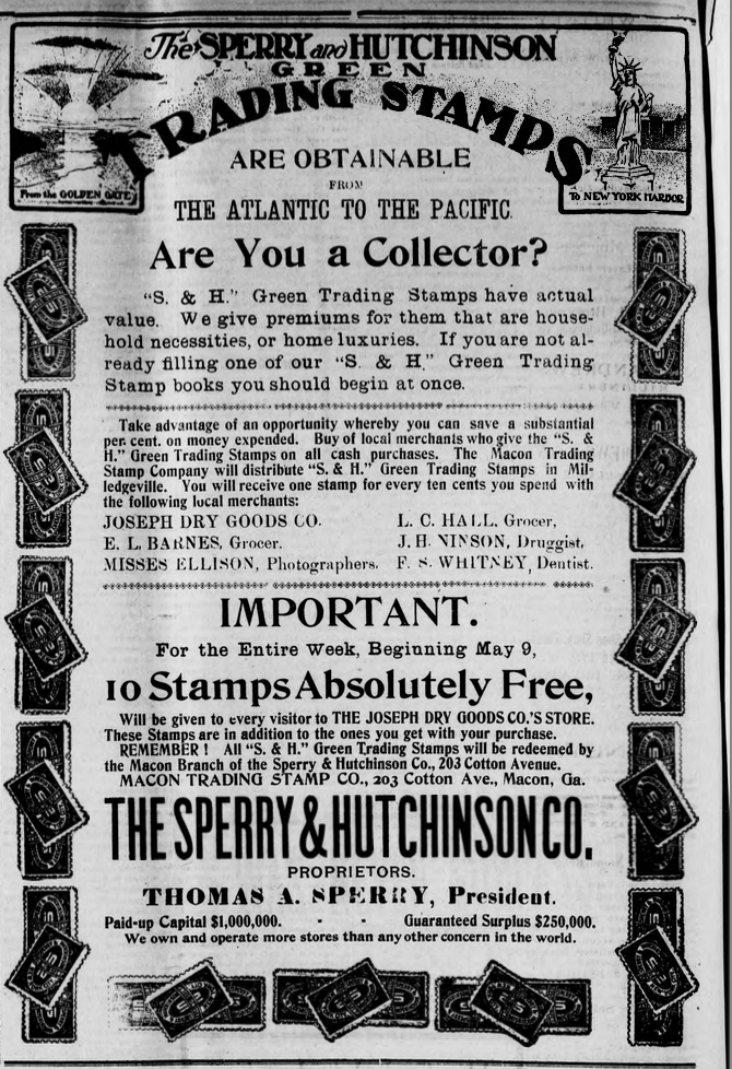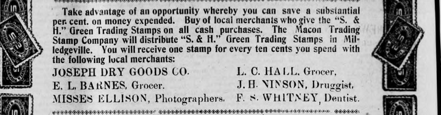 Advertisements appeared in the Union Recorder September 1903, and May 1904, for Sperry & Hutchinson who listed the Misses Ellison under Photographers among the several local businesses who were giving out the S&H company’s “Green Stamps,” with every ten cents spent. Businesses continued this practice of giving Green Stamps through much of the twentieth century. (Union Recorder Sept. 15, 1903, pg. 7, and May 10, 1904, pg. 4).