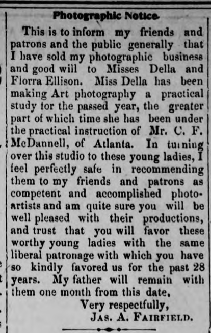 The Misses Ellison were sisters Florrie (1874 – 1952) and Della (1876 – 1971) Elllison who took over the J. A. Fairfield (McDannell’s) photographic studio in Milledgeville as of November 1898, as reported in the Council Proceedings of November 21, 1898 — “The petition of Misses Ellison to have Photographic license of J.A. Fairfield transferred to them, was read and motion granted” (Union Recorder November 29, 1898, pg. 8), although James A. Fairfied had already published a notice in the Union Recorder informing the public that he had sold the business “to the Misses Della and Florra [sic] Ellison.” He mentions that in 1897-1898, Della Ellison, a graduate of the College in Milledgeville, was apprenticed to former Milledgeville photographer Charles F. McDannell (partner with Fairfield in that city’s studio and J.A. Fairfield’s brother-in-law), who was by then in Atlanta. Fairfield’s father, photographer T. J. Fairfield (1845-1915) would work with them in the studio for one month. As of 1899, the Misses Ellison were paying an annual $10.00 tax on their Photograph Gallery (“Report of Tax Collector, July 6, 1899 — special taxes collected for 1899” in Union Recorder, July 18, 1899, pg. 6).