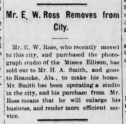 After being in business only twelve years, the Misses Ellison sold their studio to a Mr. E. W. Ross, who immediately sold it to H. A. (Harrison Ashley) Smith (b. 1881), a photographer who had been living in Milledgeville and working and advertising regularly as a photographer. Listed as a traveling photographer in the 1910 census, he had several more permanant locations in the city. Thus, with this studio purchase, he was able to “enlarge his business and render more efficient service.” He probably left Milledgeville around 1918. He previously worked as a photographer in Dublin, Georgia, 1900-1903, and Smith continued in that line into 1940, when the census lists him as a helper in a photography shop.