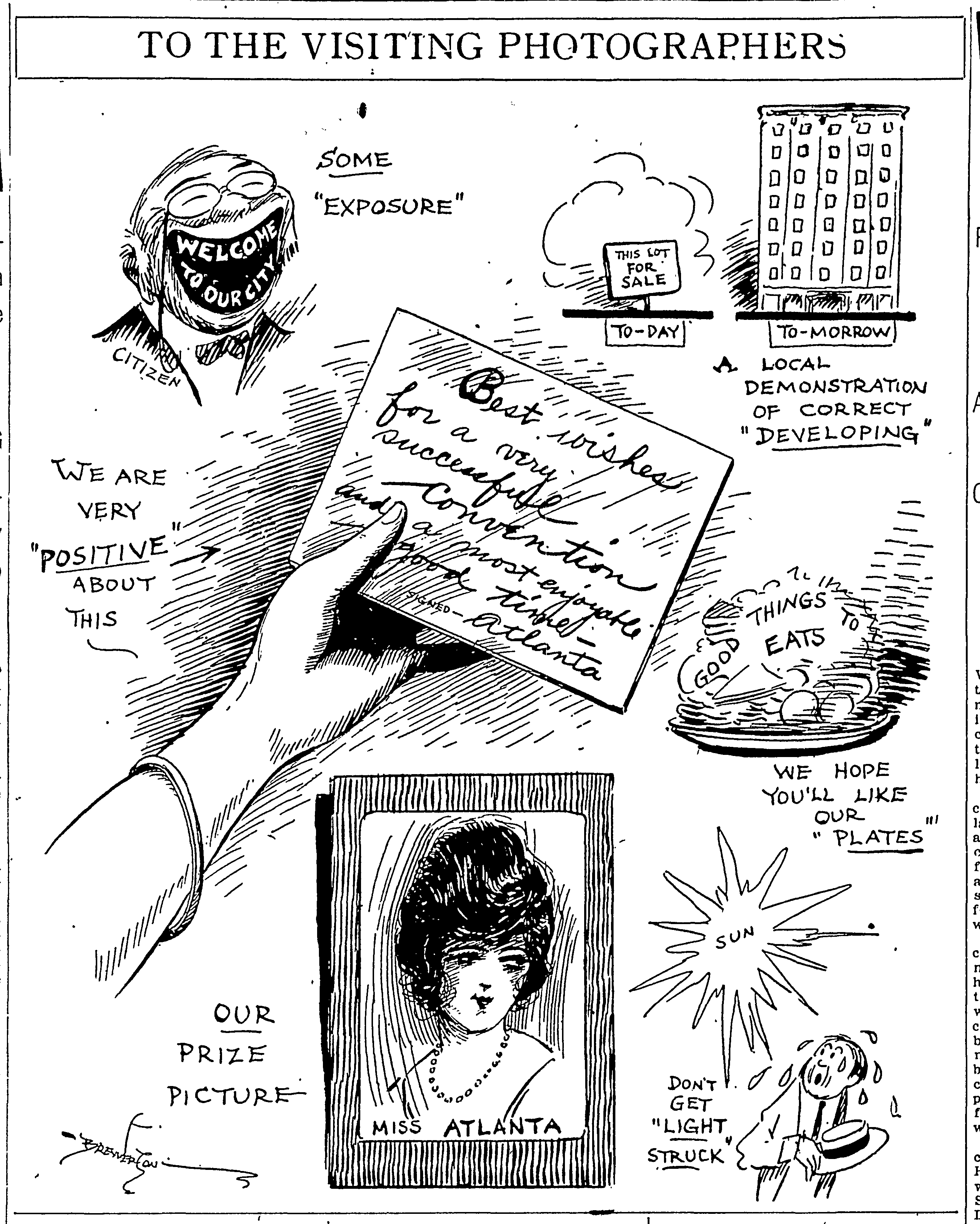 In mid-June 1914 the annual Photographers Association of America, with about 1,000 delegates, was held in Atlanta, Georgia, and the Launey Studio (Garnett) and at least five other Georgia photographers were there. Temperatures were well into the 90s — it was hot. The cartoon by Alfred W. Brewerton, whose cartoons appeared in Atlanta newspapers, 1910-1920, suggests the heat was a part of the city’s Welcome (“Photographers Gather for Annual Convention,” Atlanta Journal, June 15, 1914, pg. 1, col. 5 and pg. 5, col. 2-3) .